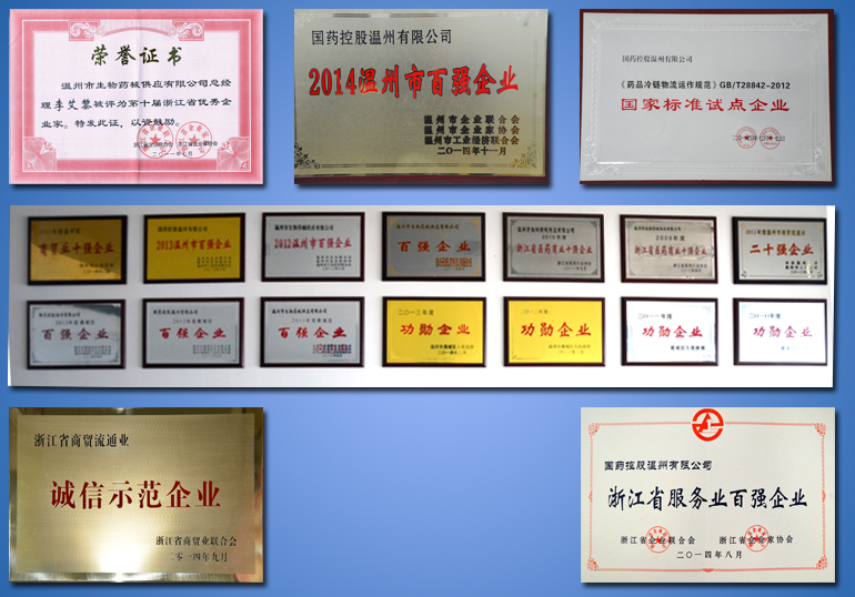 2014年被評(píng)為浙江省重點(diǎn)流通企業(yè)、浙江省服務(wù)業(yè)百強(qiáng)企業(yè),浙江省商貿(mào)流通業(yè)誠信示范企業(yè),《藥品冷鏈物流運(yùn)作規(guī)范》GB/T28842-2012國(guó)家標(biāo)準(zhǔn)試點(diǎn)企業(yè)李艾黎總經(jīng)理榮膺2011年浙江省優(yōu)秀企業(yè)家稱號(hào)